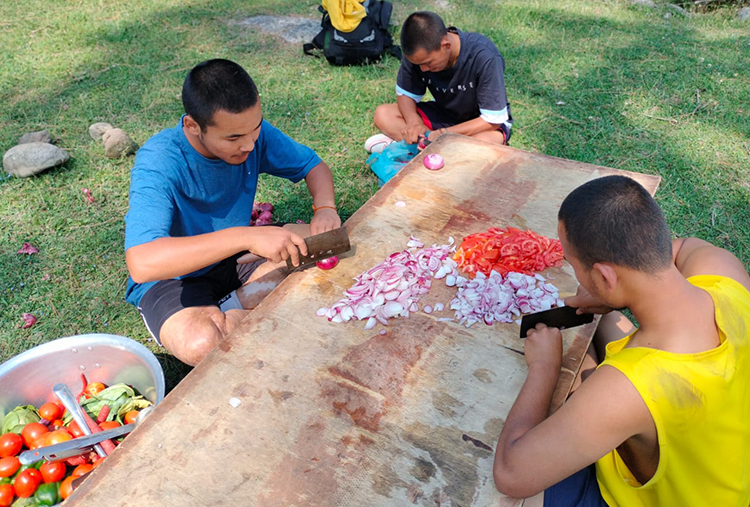 Excitement was palpable on the day of the hike, with none of the students having previously visited the campsite. The route took roughly an hour and traversed farms, fields, woods, and railway tracks. The teachers led the way, stopping to rest, appreciate the surroundings, observe village life, and watch wildlife. On reaching the site, the students made smoke offerings to invoke the dharma protectors’ blessings and pray for harmony with nature. Teachers then encouraged students to spend time relaxing under the trees or by the nearby stream to soak in their surroundings. Next, under the watchful eyes of their teachers and with a little help from the older students, the younger ones were tasked with collecting fallen branches and twigs to use as firewood while the rest of the group prepared lunch. There was also plenty of time for swimming, group games, and simply lying down to sky-gaze. In the late afternoon the students gathered their things and cleaned up the campsite, ensuring that it was left pristine.
