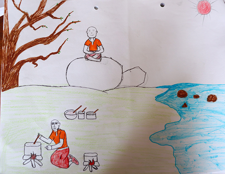 Back in the classroom the following day, the students reflected on and discussed the Maitri Day camp and recorded their impressions in prose, poetry, and artwork. Fourteen-year-old Ngawang Sangey recalled the vibrant green of the fields while seven-year-old Tashi remembered the sweet taste of the refreshing, juicy watermelon chunks he had devoured after the long trek to the campsite. Ten-year-old Sonam Choejor shared that, as he sat with his eyes closed after the smoke offerings, he could distinctly hear the birds singing in the meadow and the leaves rustling as the wind blew through the trees. Older students, enchanted by the meadow, wished that they could have stayed there overnight. Swimming, splashing, and playing ball in the stream were highlights of the hike in the students’ collective memory as they savored the coolness of the water. Food had never tasted so delicious after all the hard work of chopping the vegetables, washing the rice, building the firepit, and managing the entire cooking process—back at school, this is all done by the cooks! Something all the senior students noted was how the harmonious teamwork made everything so easy to manage—even the little ones had gone out of their way to share the workload. It was inspiring to see how the experience had resonated with the students, creating lasting memories and reinforcing the values of mindfulness and appreciation for the present moment.