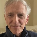 A white haired gentleman in a plaid shirt sits in front of a library of books.