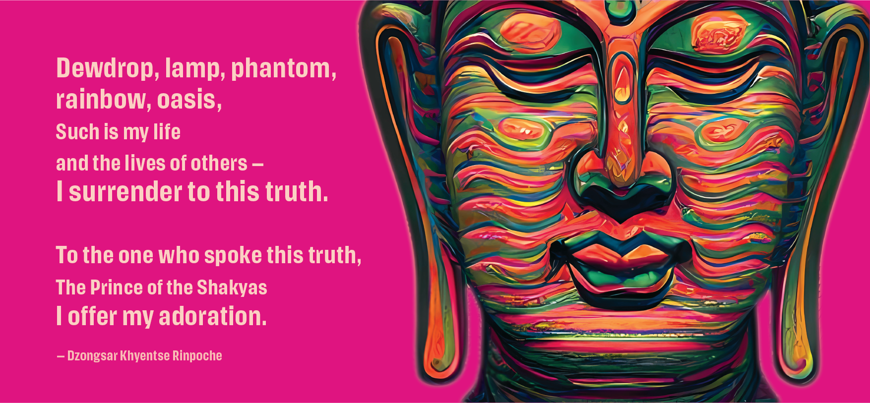 Suggestive of the imagery in the excerpt from Dzongsar Khyentse Rinpoche’s “Invocation,” the illustration was created using a combination of AI and design tools. The Bardo Café’s stated aim is to offer core Buddhist teachings on mindfulness and awareness in a secular, fun, and inclusive way through art, music, poetry, and other creative avenues. Their goal is to inspire young minds to develop a deeper sense of awareness, purpose, and meaning in life. A collection of art, poetry, and stories can be found on their Instagram page.