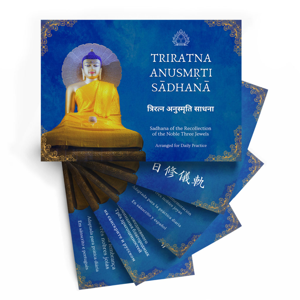 For the past 2 years, an international group of practitioners has been gathering online to chant the Triratna Anusmṛti Sādhanā in English, Sanskrit, and Chinese. In March, we resume the regular practice with a new arrangement of the liturgy and, for the first time, include three new languages: Portuguese, Spanish, and Russian. A new translation of “The Noble Sūtra of Recollecting the Three Jewels” by 84000: Translating the Words of the Buddha is also included in the recently edited liturgy. This accessible yet profound sadhana, composed by Dzongsar Khyentse Rinpoche, was first introduced under the Bodhi Tree during the Siddhartha Festival in Bodhgaya in 2018. The sadhana, in all five modern languages, and other resources are available here. Each practice session lasts about 40 minutes.