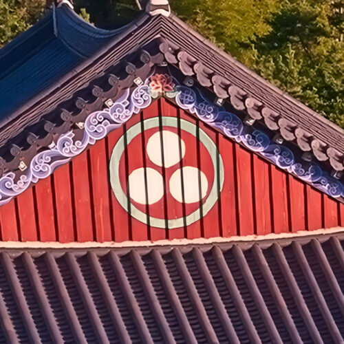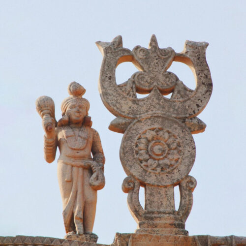 Historically, The Triple Gem has been rendered in a variety of ways. In ancient India, the triratna(Sanskrit: tri-ratna or ratna-traya) symbol is commonly represented by a trident or three wheels and can be found on many ancient coins and stone sculptures. In Japan and Korea, three small circles inside a larger circle are painted on the roofs of Buddhist temples. In Tibetan art, The Three Jewels (Tibetan: dkon-mchog gsum) are typically shown at the bottom of thangka paintings encircled by flames. Visit the exhibition at Siddhartha’s Intent Online Gallery.