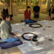 Excitement was palpable on the day of the hike, with none of the students having previously visited the campsite. The route took roughly an hour and traversed farms, fields, woods, and railway tracks. The teachers led the way, stopping to rest, appreciate the surroundings, observe village life, and watch wildlife. On reaching the site, the students made smoke offerings to invoke the dharma protectors’ blessings and pray for harmony with nature. Teachers then encouraged students to spend time relaxing under the trees or by the nearby stream to soak in their surroundings. Next, under the watchful eyes of their teachers and with a little help from the older students, the younger ones were tasked with collecting fallen branches and twigs to use as firewood while the rest of the group prepared lunch. There was also plenty of time for swimming, group games, and simply lying down to sky-gaze. In the late afternoon the students gathered their things and cleaned up the campsite, ensuring that it was left pristine.